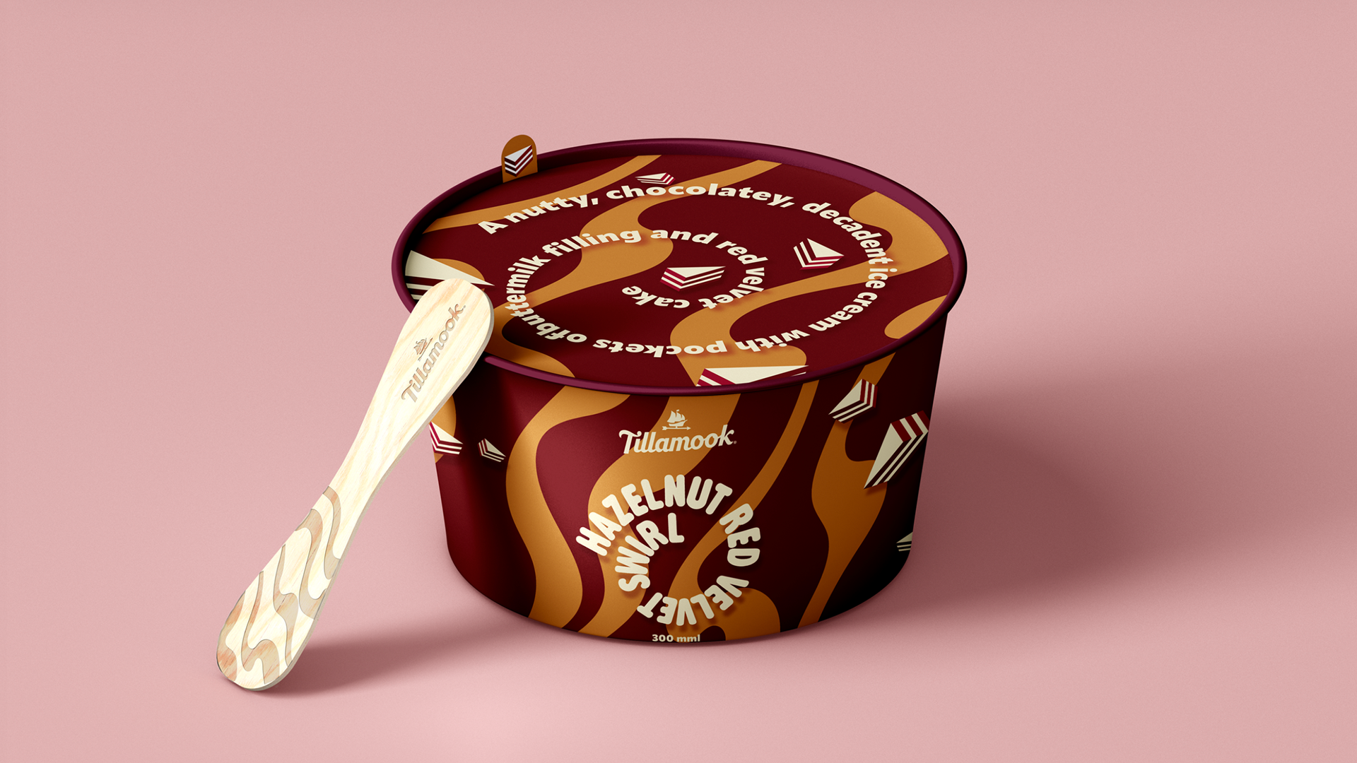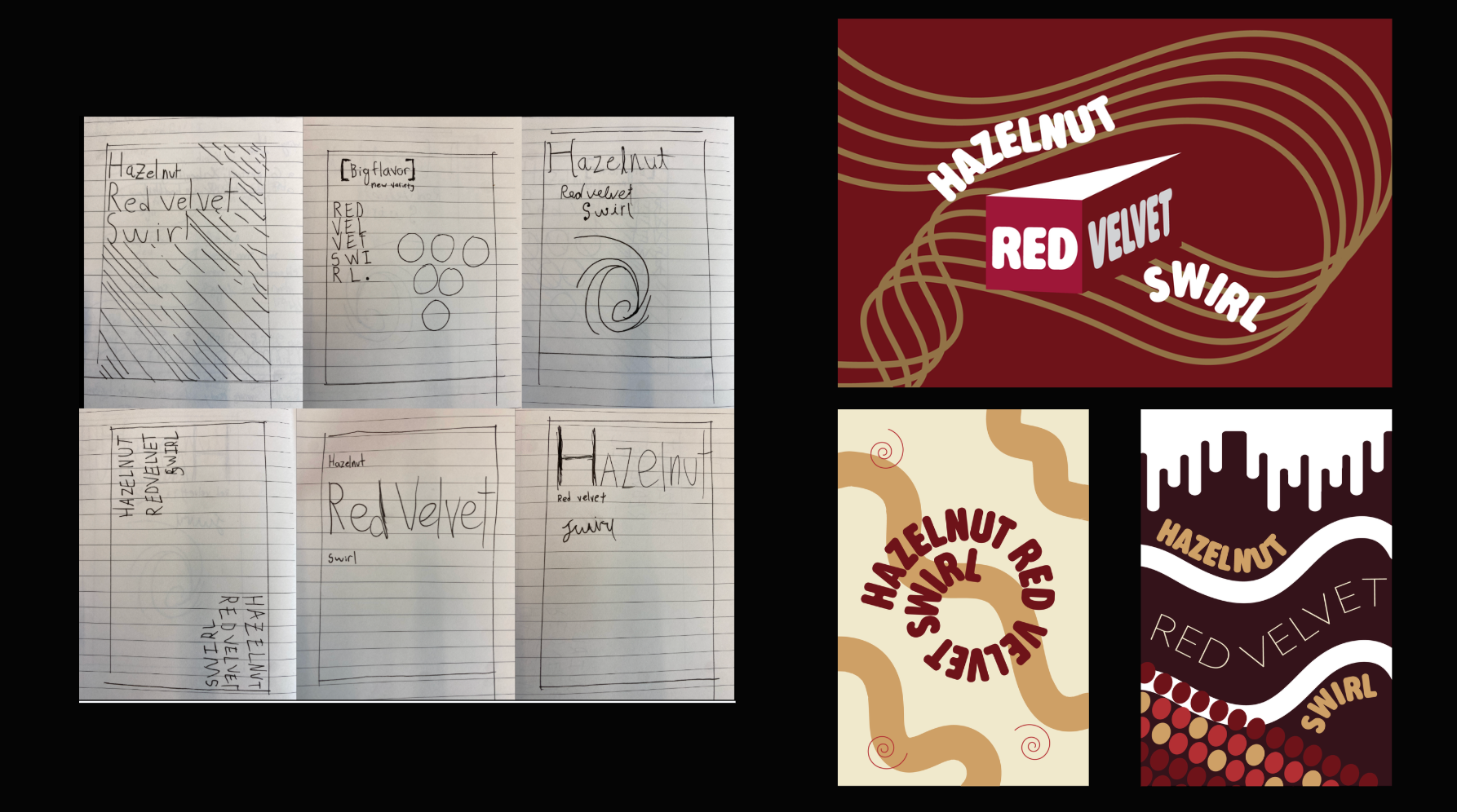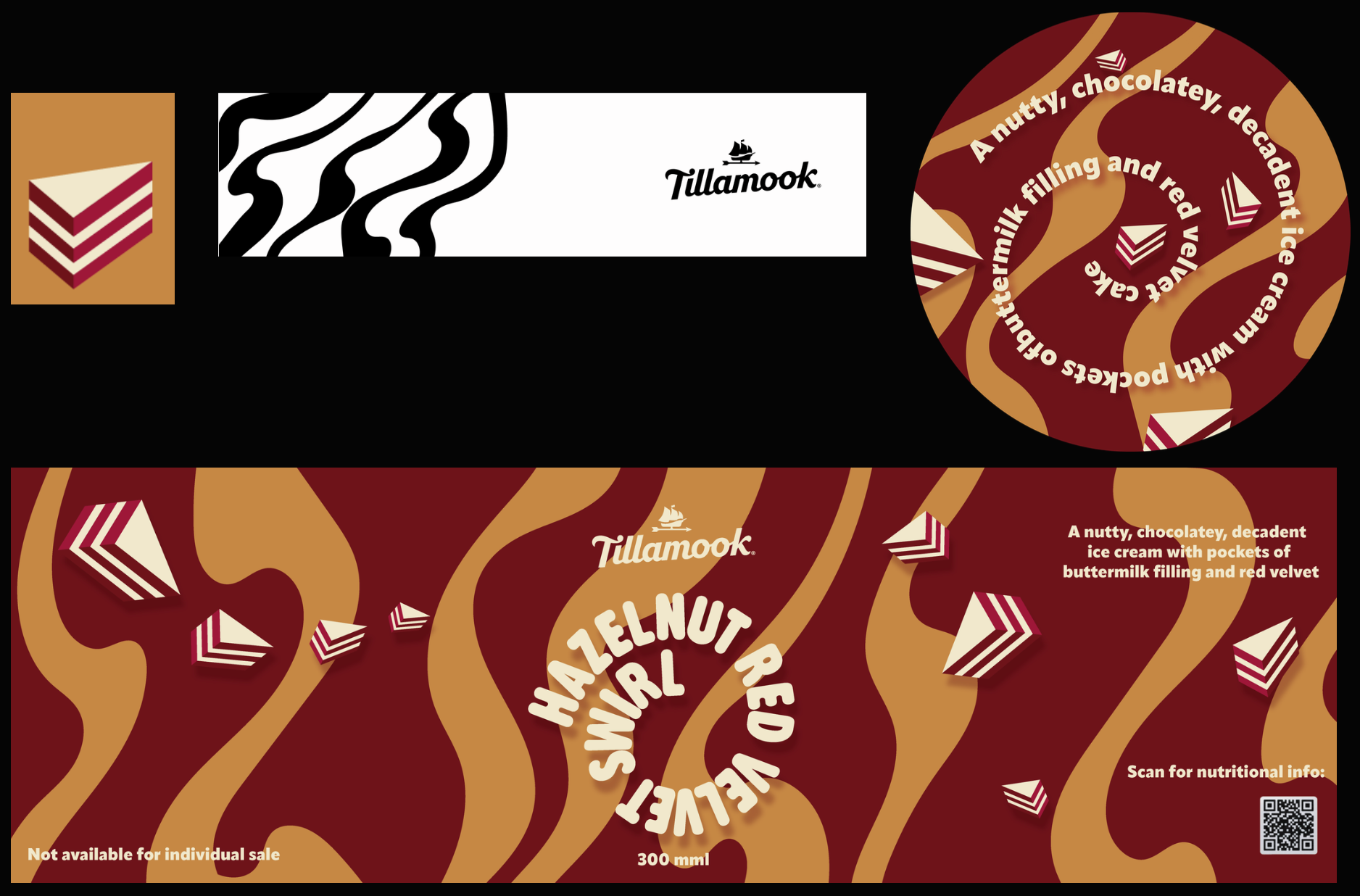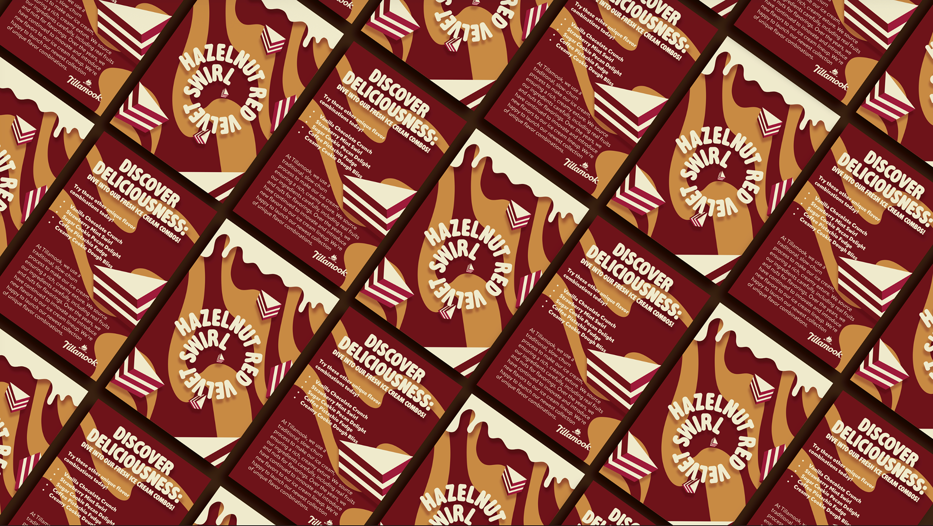 In this project, I made Tillamook a design that is representative of a unique flavor combination; Hazelnut Red Velvet Swirl. I was the art director and producer in this project. The packaging was inspired by oozy patterns, rich colors, and delicious red velvet cake.